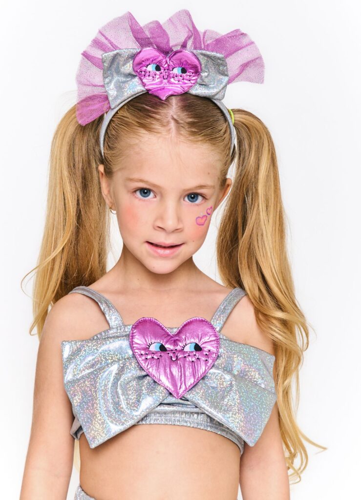 O conjunto infantil Coração Divertido é feito em tecido com brilho e traz um top com aplique de coração no busto, além de short com elástico no cós e frente transpassada, garantindo conforto durante toda a folia.