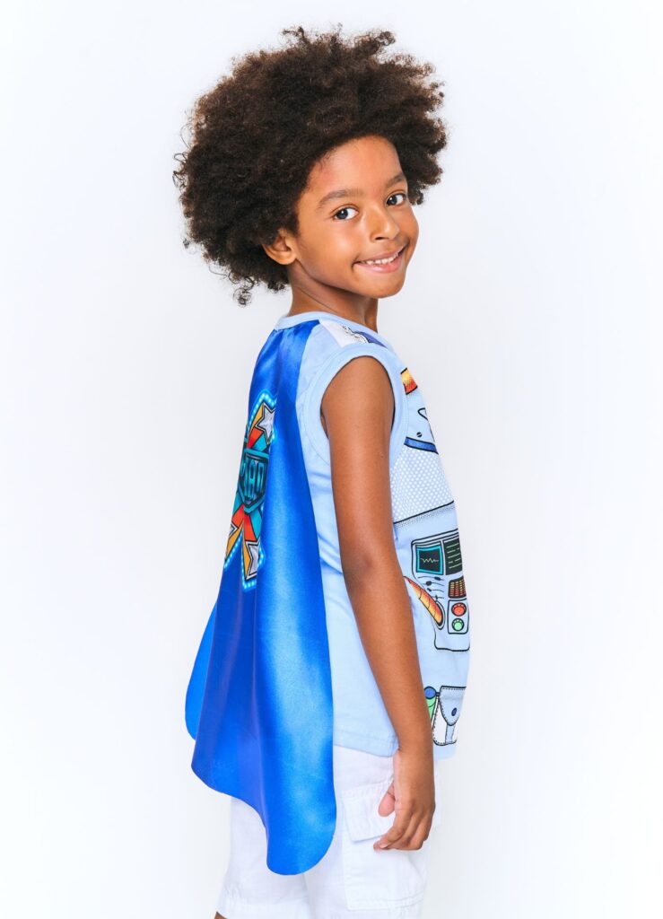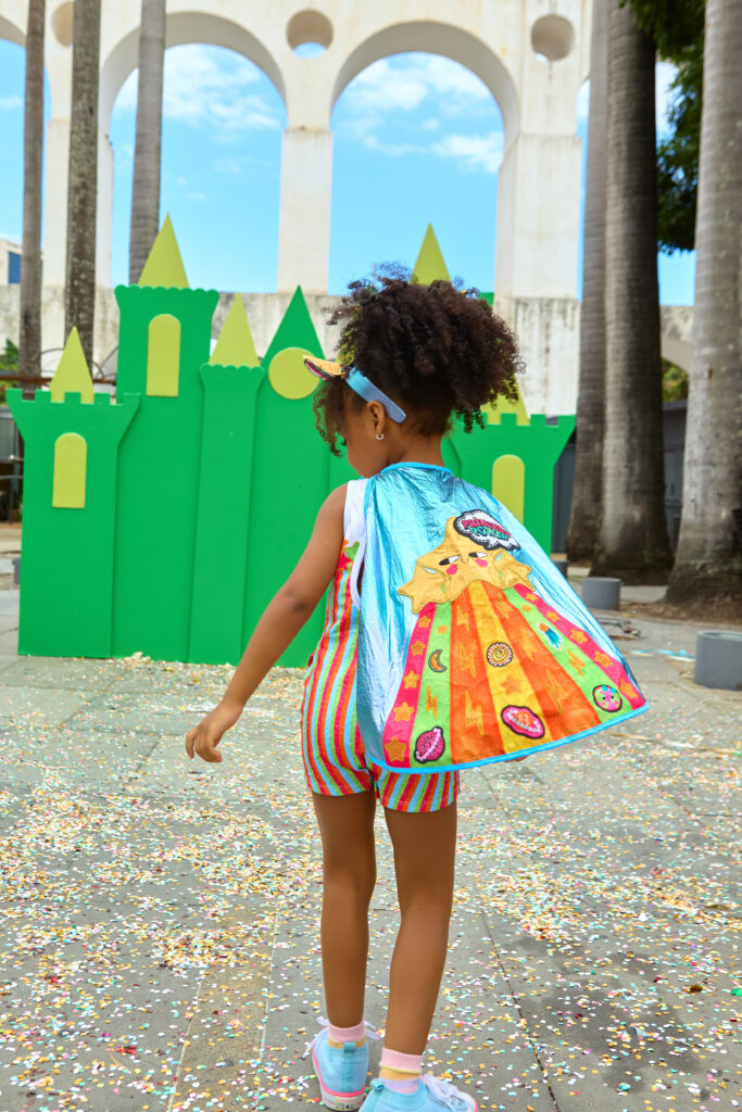 Outra opção que deve fazer sucesso no carnaval infantil é a fantasia Alegria Galáctica. O maiô possui listras e apliques de estrelas, enquanto acessórios como capa e arco, vendidos separadamente, deixam a produção ainda mais divertida.